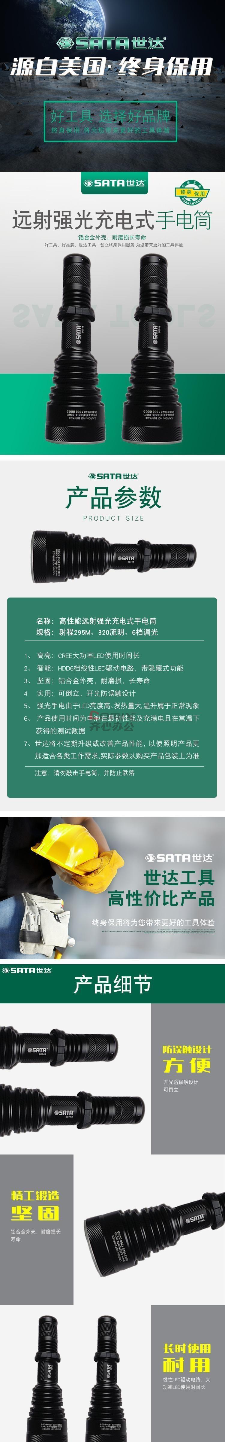 商品名称:世达 90748 远射强光充电式手电筒 射程295M 最亮320lm 6档调光 黑色 单位:只