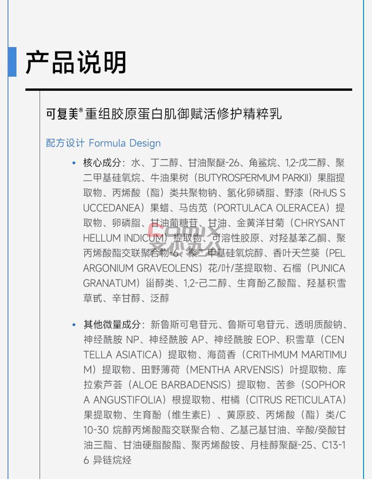 商品名称:可复美 80ml 重组胶原蛋白肌御赋活修护精粹乳 单位:瓶