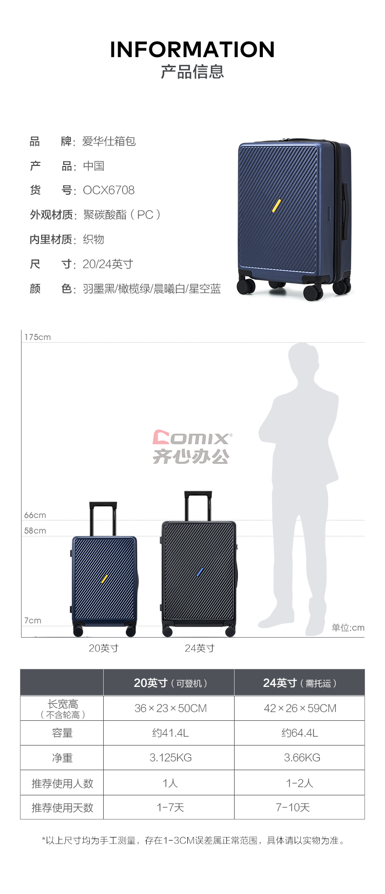 商品名称:爱华仕 OCX6708 斜杆行李箱 20英寸 41.4L 黑色 单位:个
