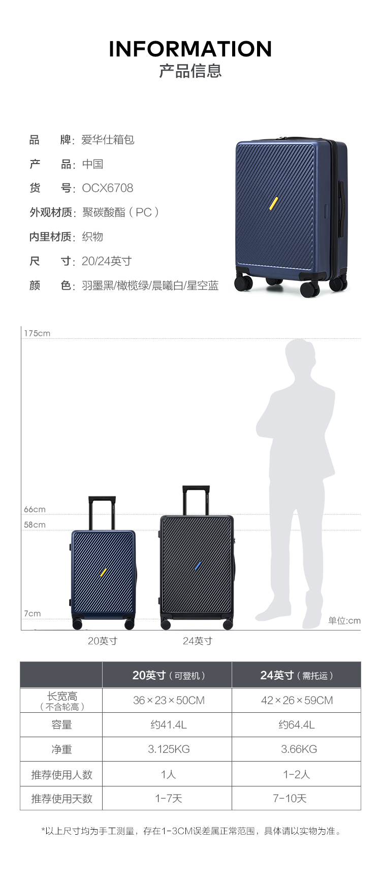 商品名称:爱华仕 OCX6708 斜杠行李箱 24英寸64.4L 白色 单位:个