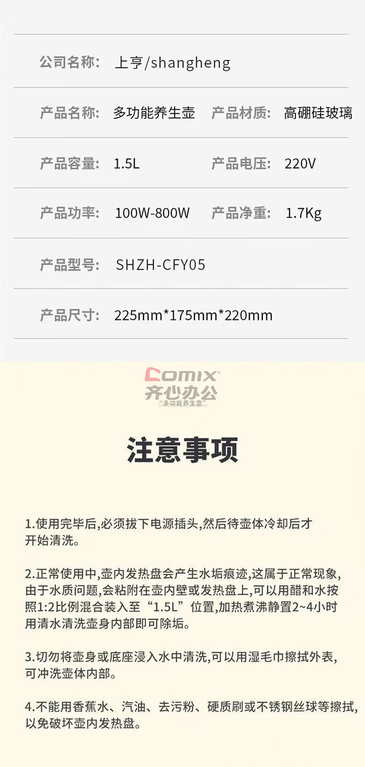 商品名称:上亨 SHZH-CFY05 养生壶 不带滤网 1.5L 白色 单位:台