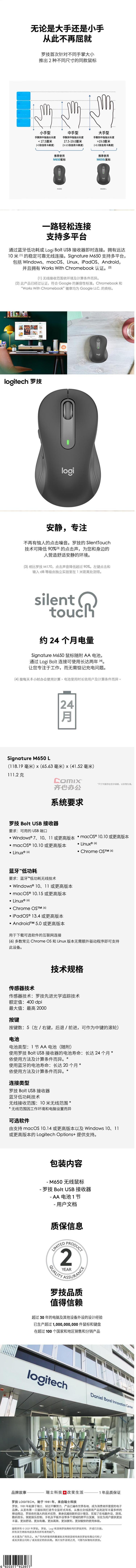 商品名称:罗技 M650 L 无线光电蓝牙鼠标双模连接 大手型适用 办公轻音鼠标 商用版 黑色 个