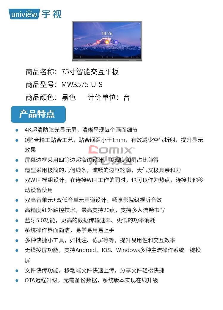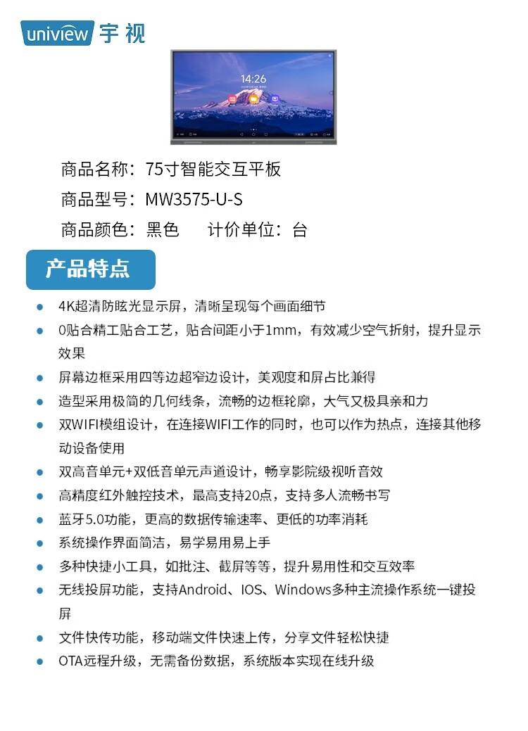 - 商品名称:宇视科技(UNIVIEW) MW3575-U-S 75寸 智能交互平板 1.00 套/台 (计价单位:台) 黑色