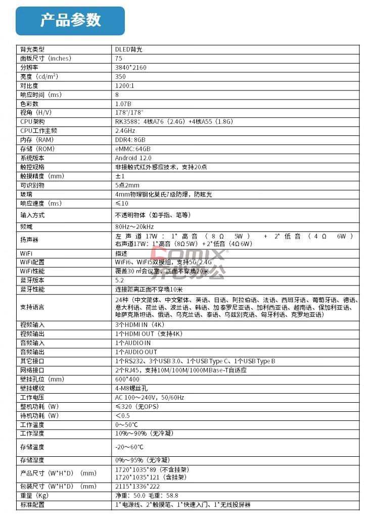 | 商品型号 | MW3575-U-S 75寸 |