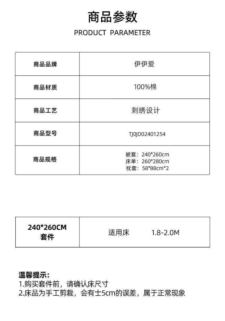 - 商品名称:伊伊爱 TJ0JD02401254 240*260cm【适用被芯220*240cm】 纯棉80S酒店套房四件套1.8床 床上套件 (计价单位:套) 典雅