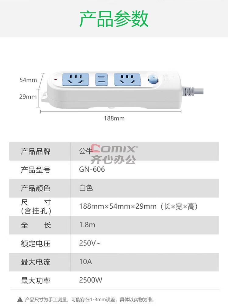 商品名称:公牛GN-606总控3位插排1.8米(个)