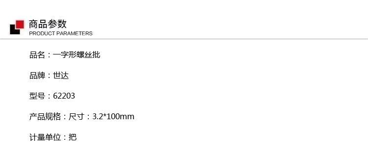 商品名称:世达 62203 尺寸:3.2*100mm 一字形螺丝批 单位:把