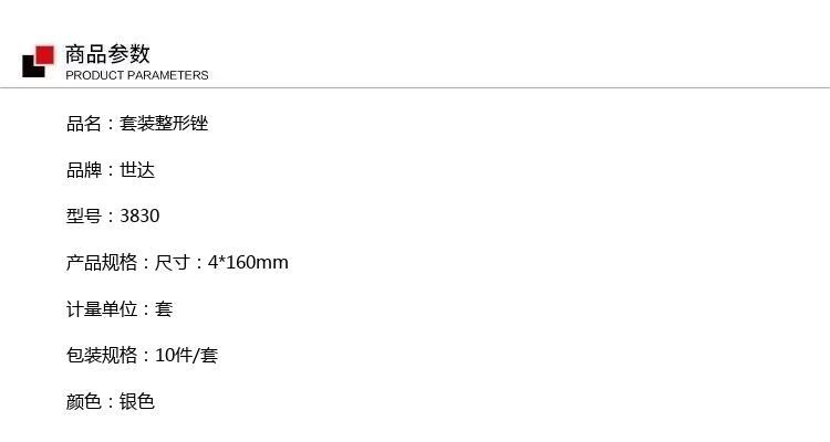 商品名称:世达 3830 尺寸:4*160mm 套装整形锉 银色 10件/套 单位:套