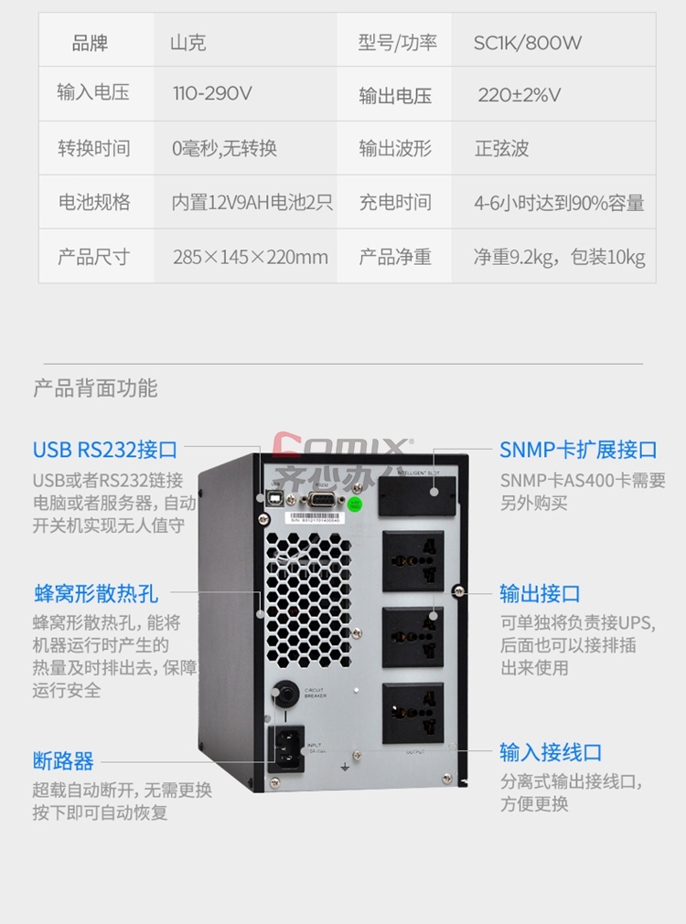 商品名称:山克 SC1K 在线式UPS不间断电源1000VA800W服务器电脑后备用电源 【塔式标机 内置电池 UPS 1 台