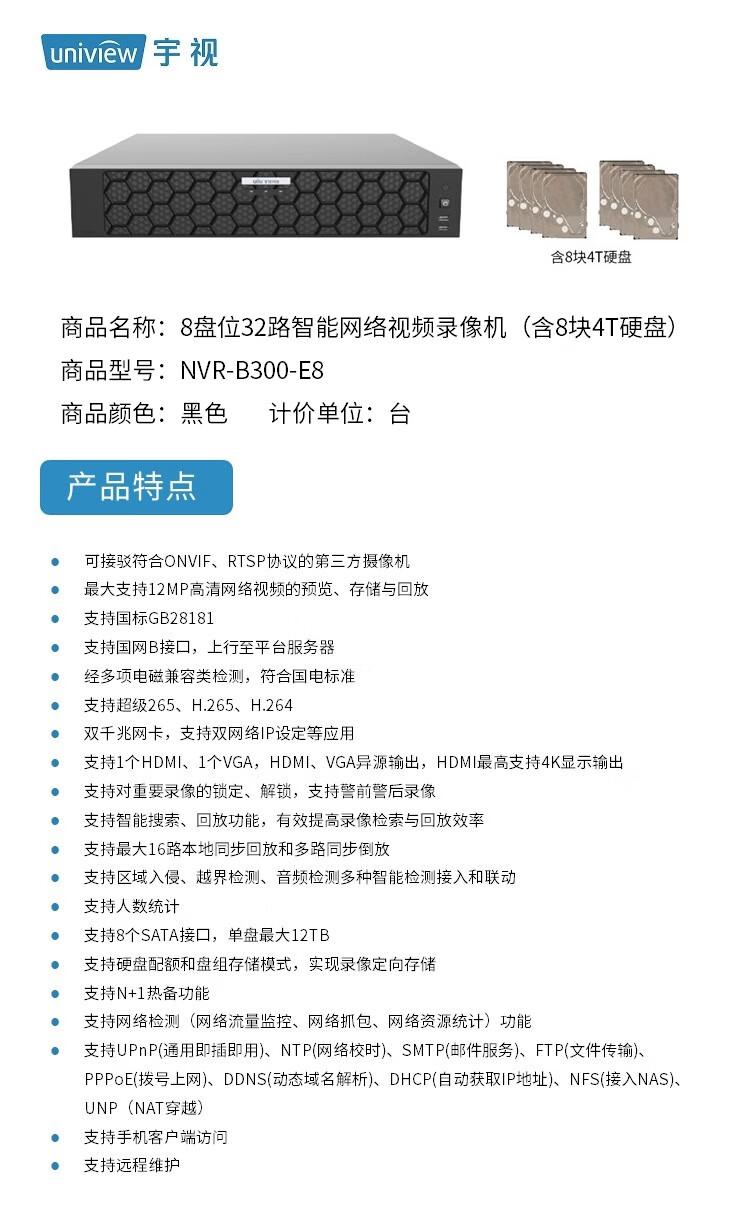 - 商品名称:宇视科技(UNIVIEW) NVR-B300-E8 含8块4T硬盘 8盘位32路网络视频录像机 (计价单位:台) 黑色