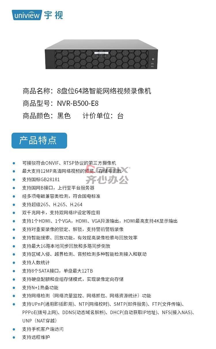 - 商品名称:宇视科技(UNIVIEW) NVR-B500-E8 8盘位64路 录像机 (计价单位:台) 黑色