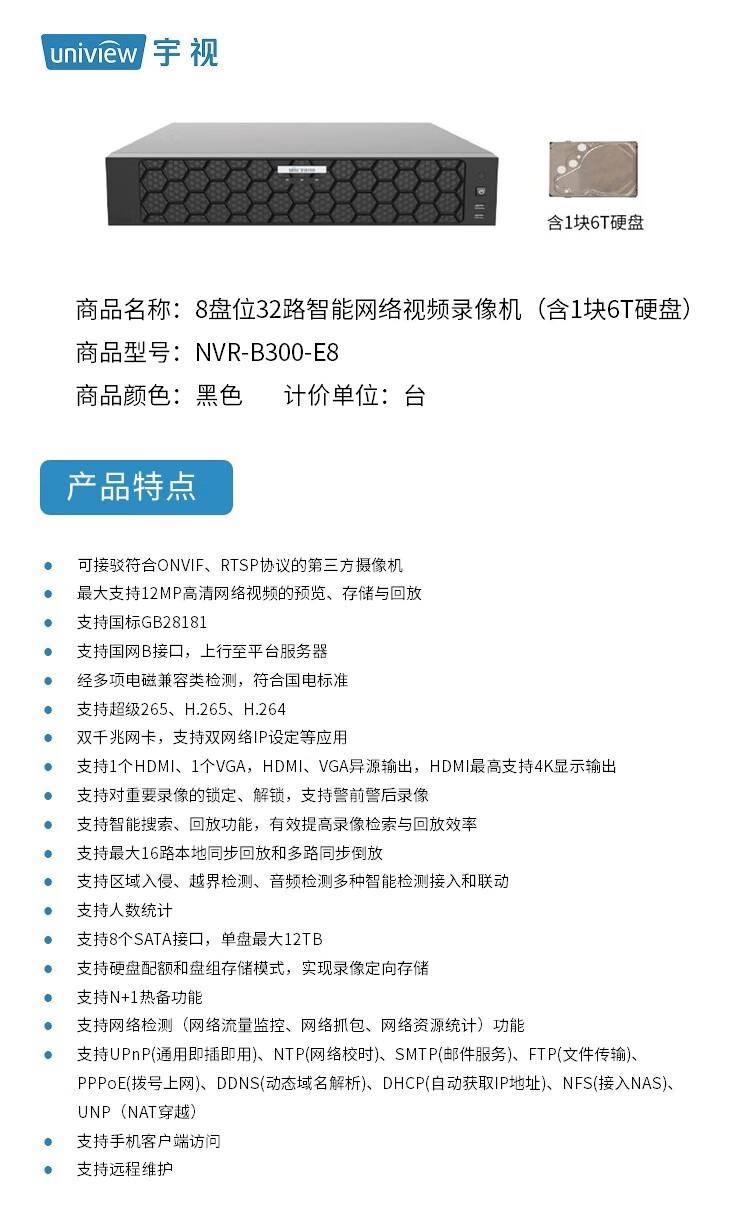- 商品名称:宇视科技(UNIVIEW) NVR-B300-E8 8盘位32路 含1块6T硬盘 录像机 (计价单位:台) 黑色