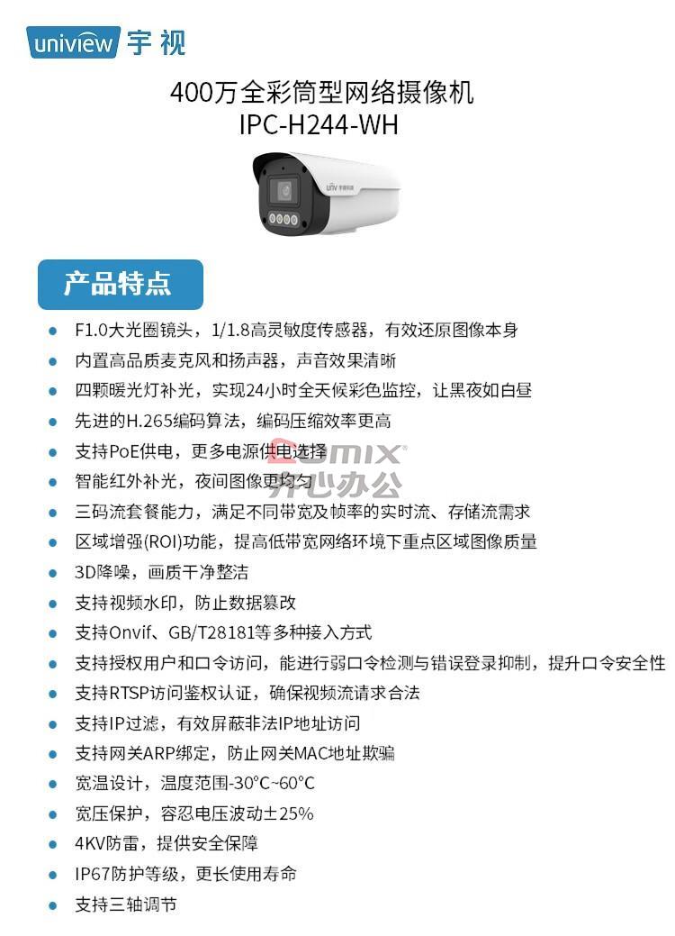 - 商品名称:宇视科技(UNIVIEW) IPC-H244-WH 4mm焦距 400万像素 智能型全彩警戒筒型 网络摄像机 (计价单位:台) 白色