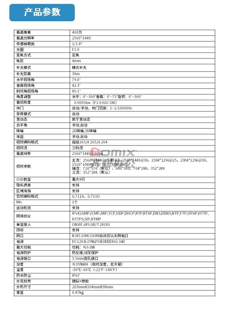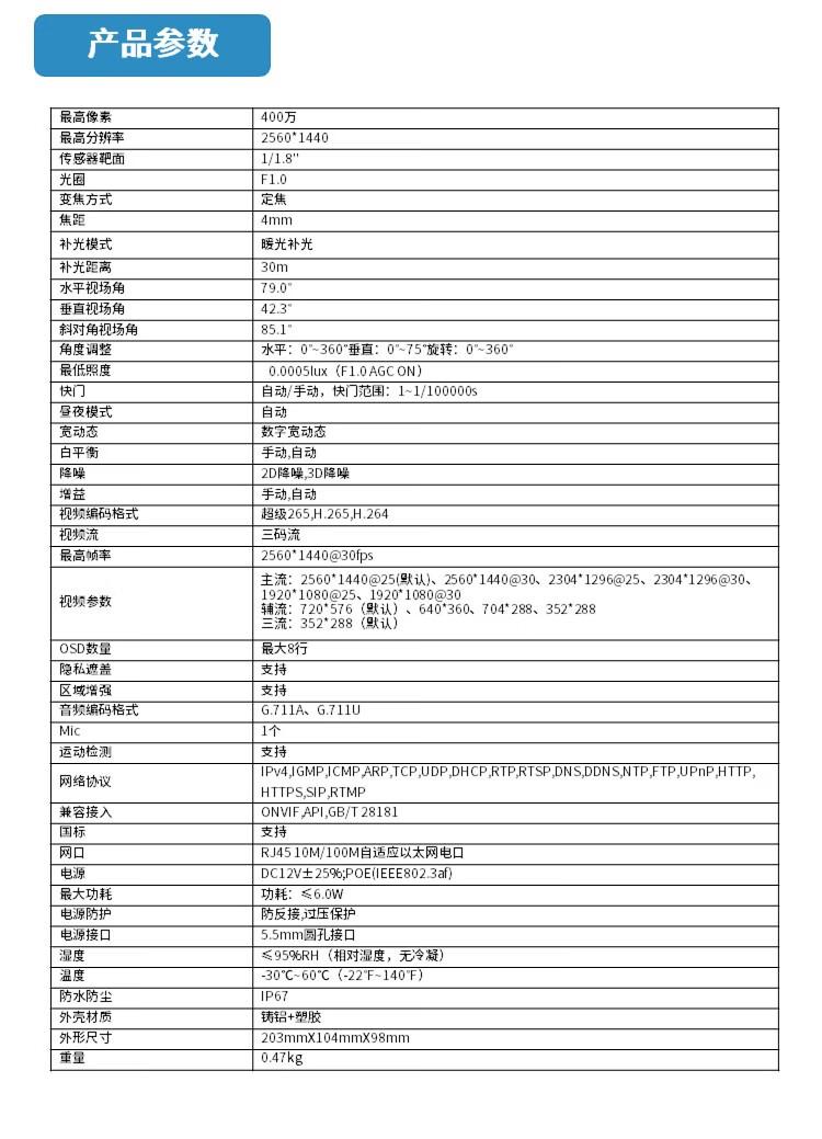 - 商品型号:IPC-H244-WH 4mm焦距 400万像素 智能型全彩警戒筒型