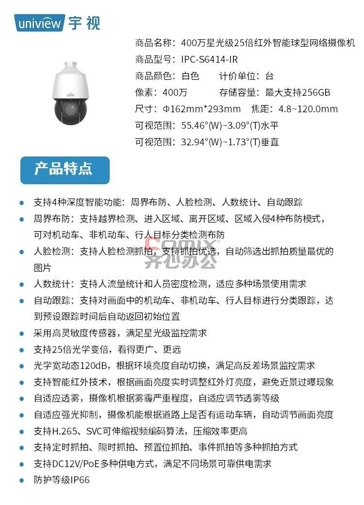 - 商品名称:宇视科技(UNIVIEW) IPC-S6414-IR 400万25倍 球形摄像机 (计价单位:台) 白色