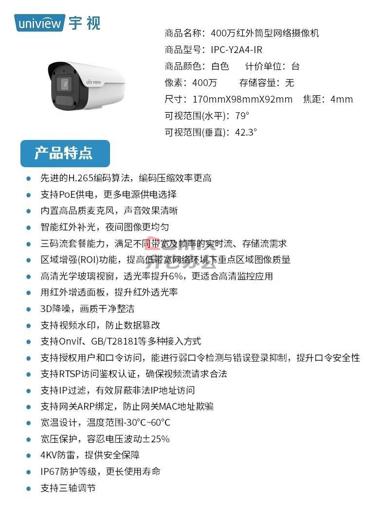 - 商品名称:宇视科技(UNIVIEW) IPC-Y2A4-IR 400万红外 筒形摄像机 (计价单位:台) 白色