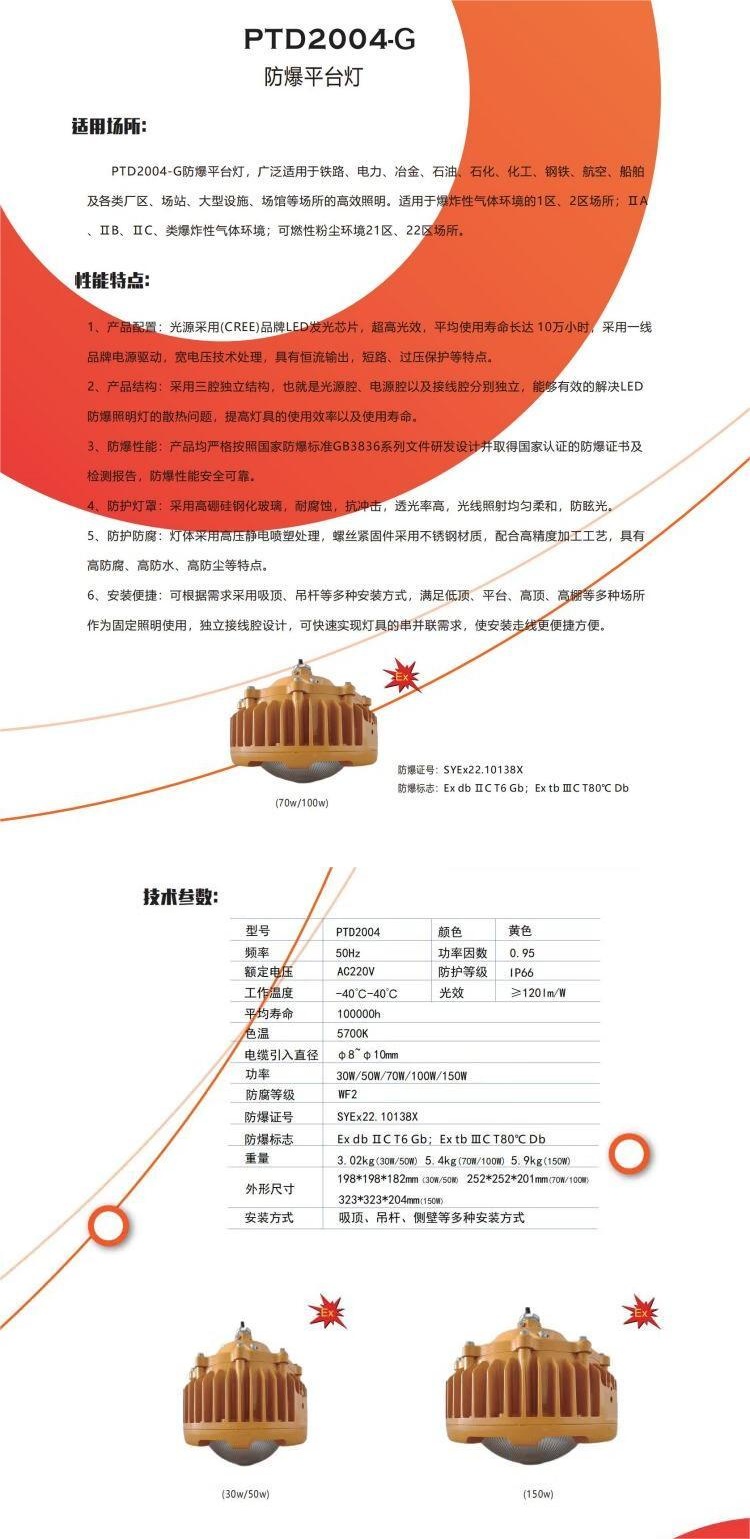 - 商品型号:PTD2004-G(含安装)150W 5700K AC220V IP66 Ex db ⅡC T6 Gb; Ex tb ⅢC T80℃ Db