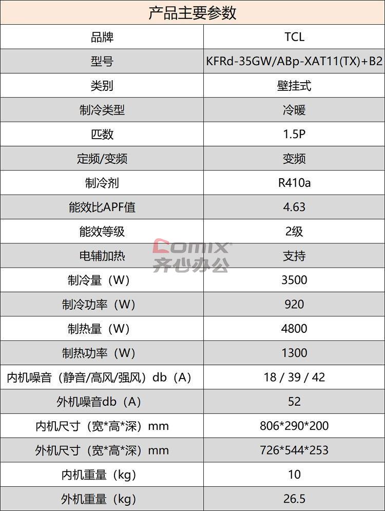 - 商品名称:TCL KFRd-35GW/ABp-XAT11(TX)+B2- 新2级 1.5匹 变频冷暖挂式空调 1.00 台/套 (计价单位:套) 白色