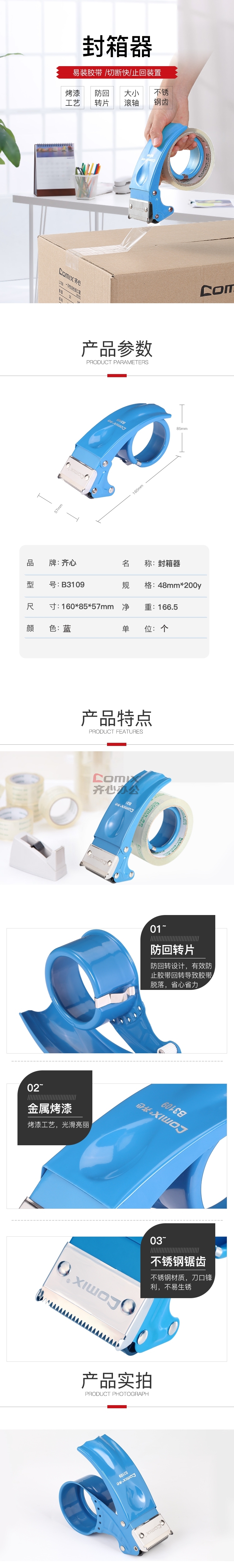 商品名称:齐心 B3109 封箱器 适用45mm/48mm宽胶带 蓝 单位:个