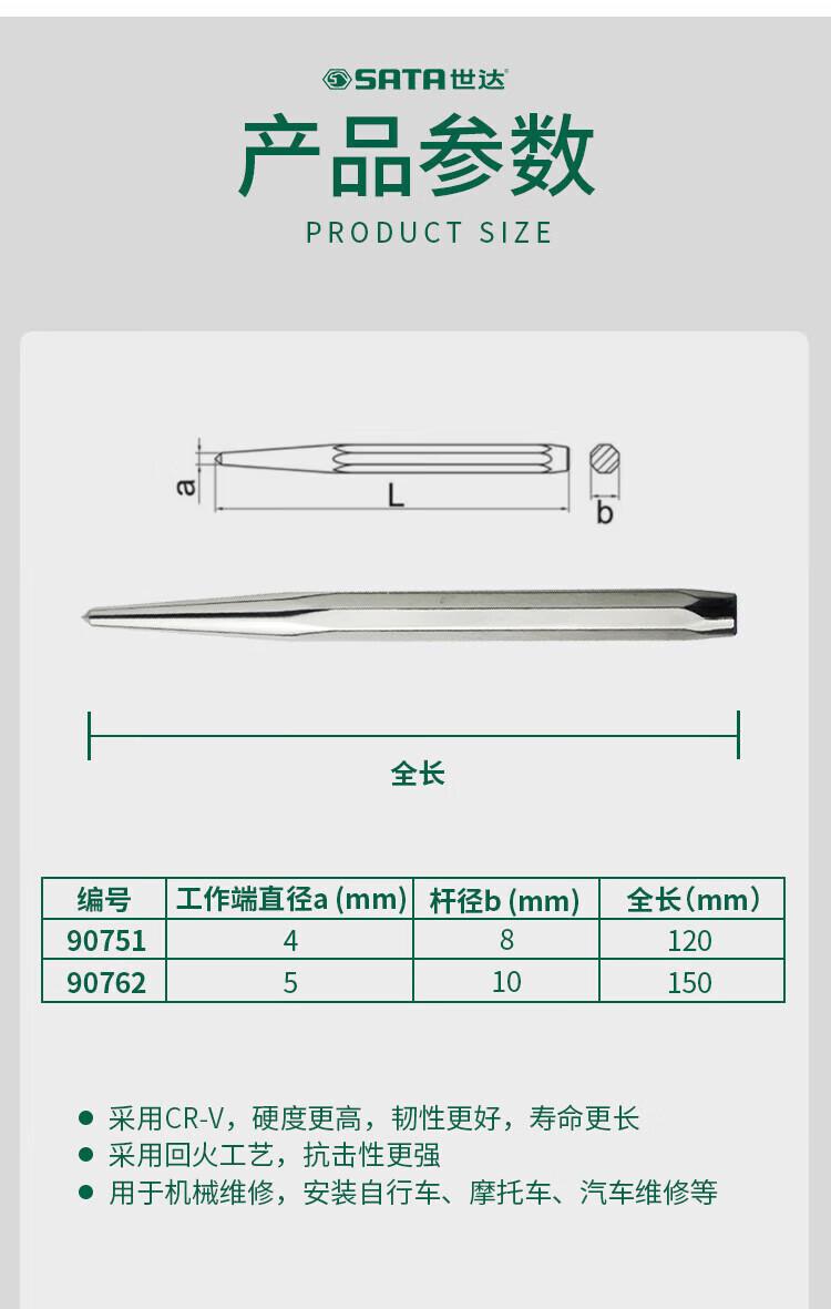 商品名称:世达 中心冲 90762 合金钢 铬钒钢 铬钒钢 5mm 5×150 _ 150mm 1把/把 把