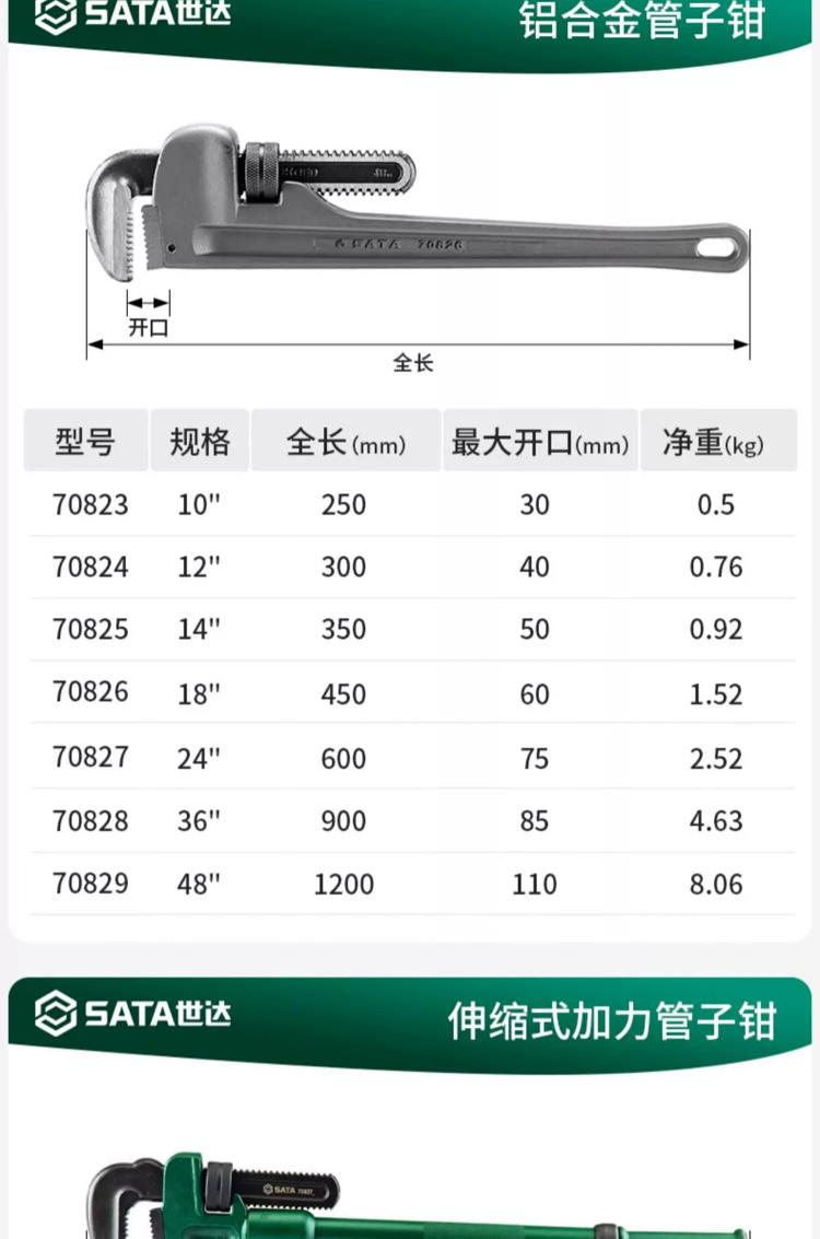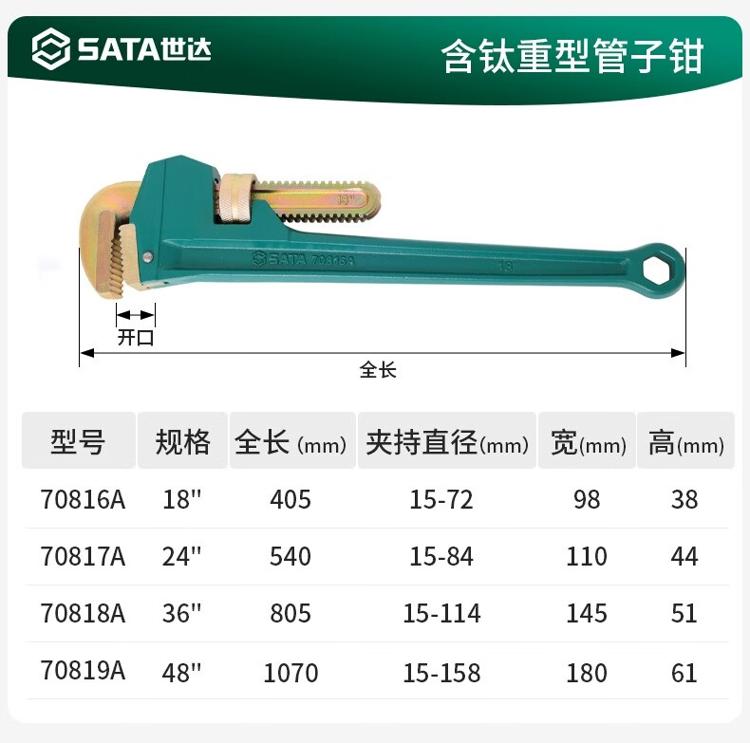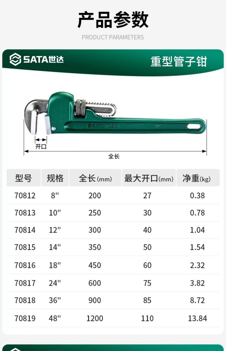 商品名称:世达 重型管钳 70815 铬钒钢 14寸 铬钒钢 14" 1.54kg 50mm 1把/把 把