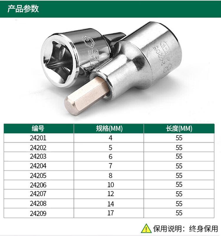 商品名称:世达(ShiDa) 24203 六角旋具套筒 12.5MM系列,50MM长,6MM 单位:个
