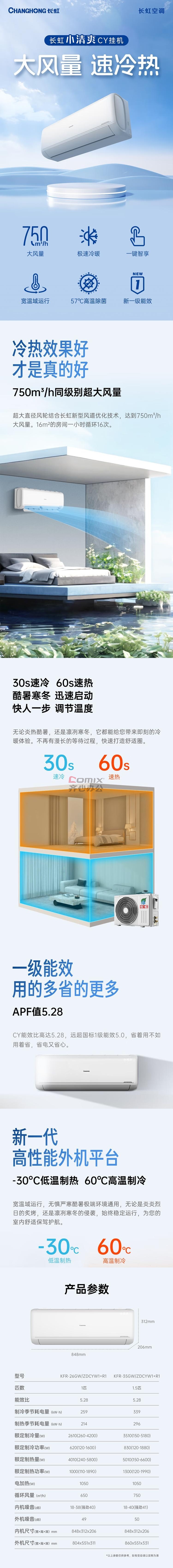 长虹1.5匹新一级能效 变频冷暖 精准控温 小清爽空调挂机 KFR-35GW/ZDCYW1+R1 单位:台
