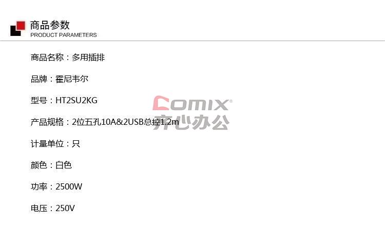- 商品名称:霍尼韦尔 多用插排 HT2SU2KG 2位五孔10A&2USB总控1.2m 只 白色 2500W 250V 单位:只