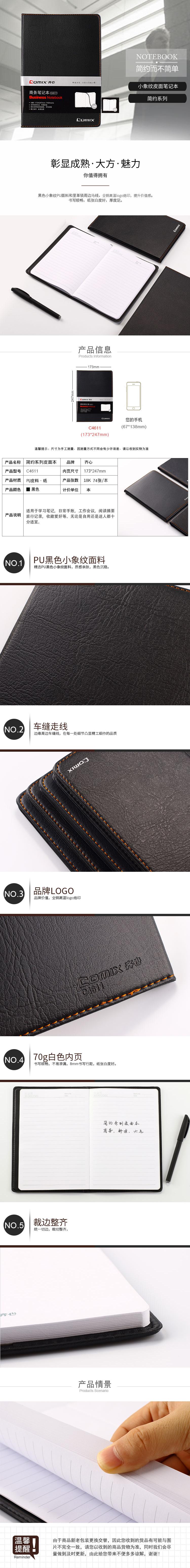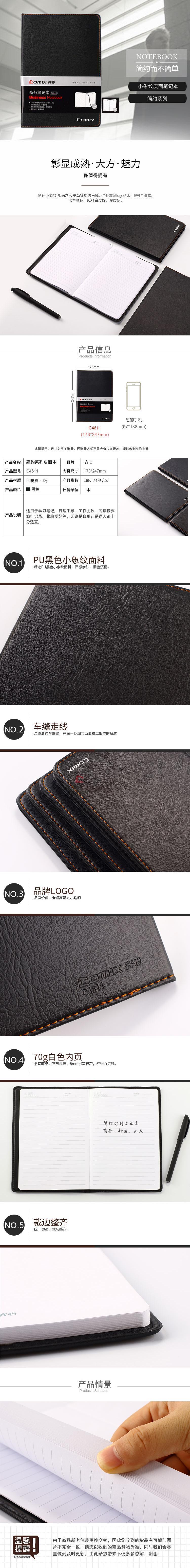 商品名称:齐心 C4611 简约系列皮面本 18K 74张 黑色 单位:本