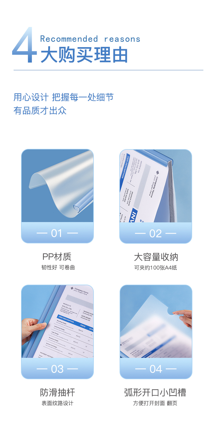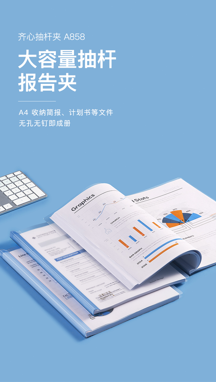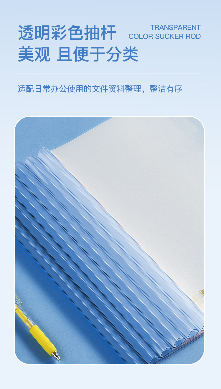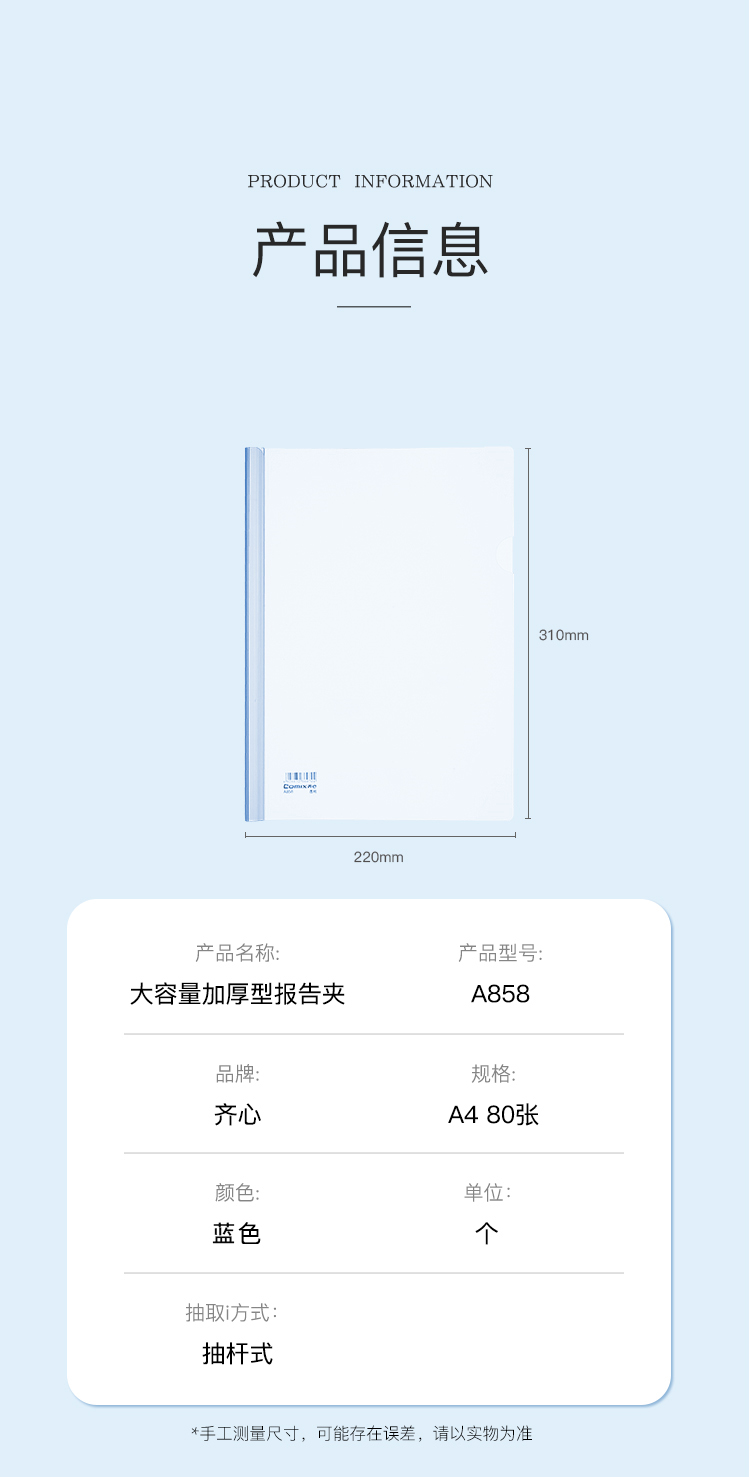 商品名称:齐心 A858 大容量加厚型报告夹 A4 抽杆式 容纸量100张 蓝色 单位:个
