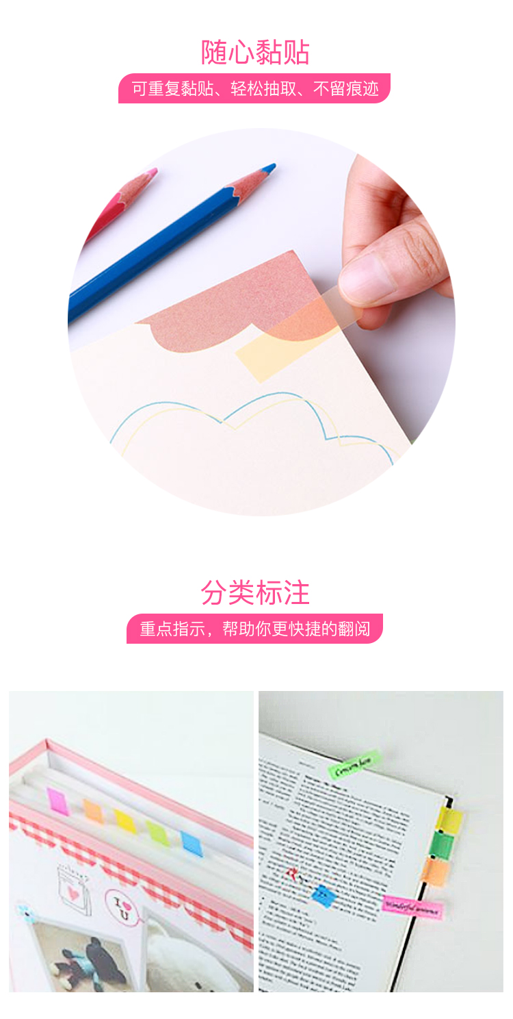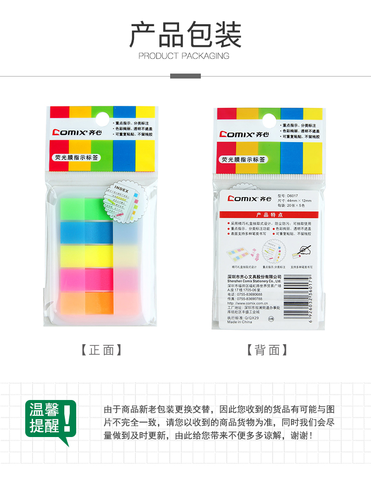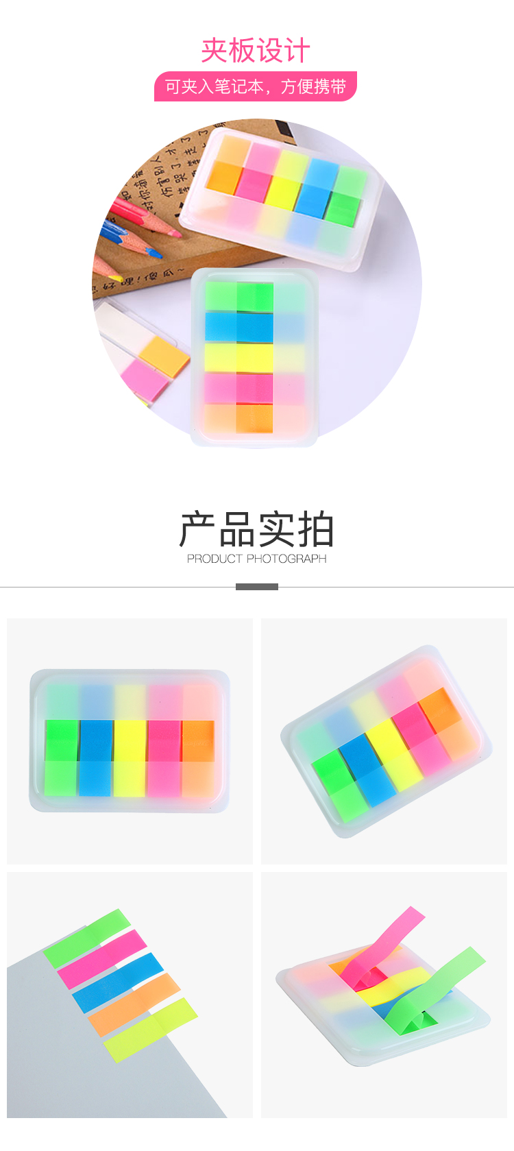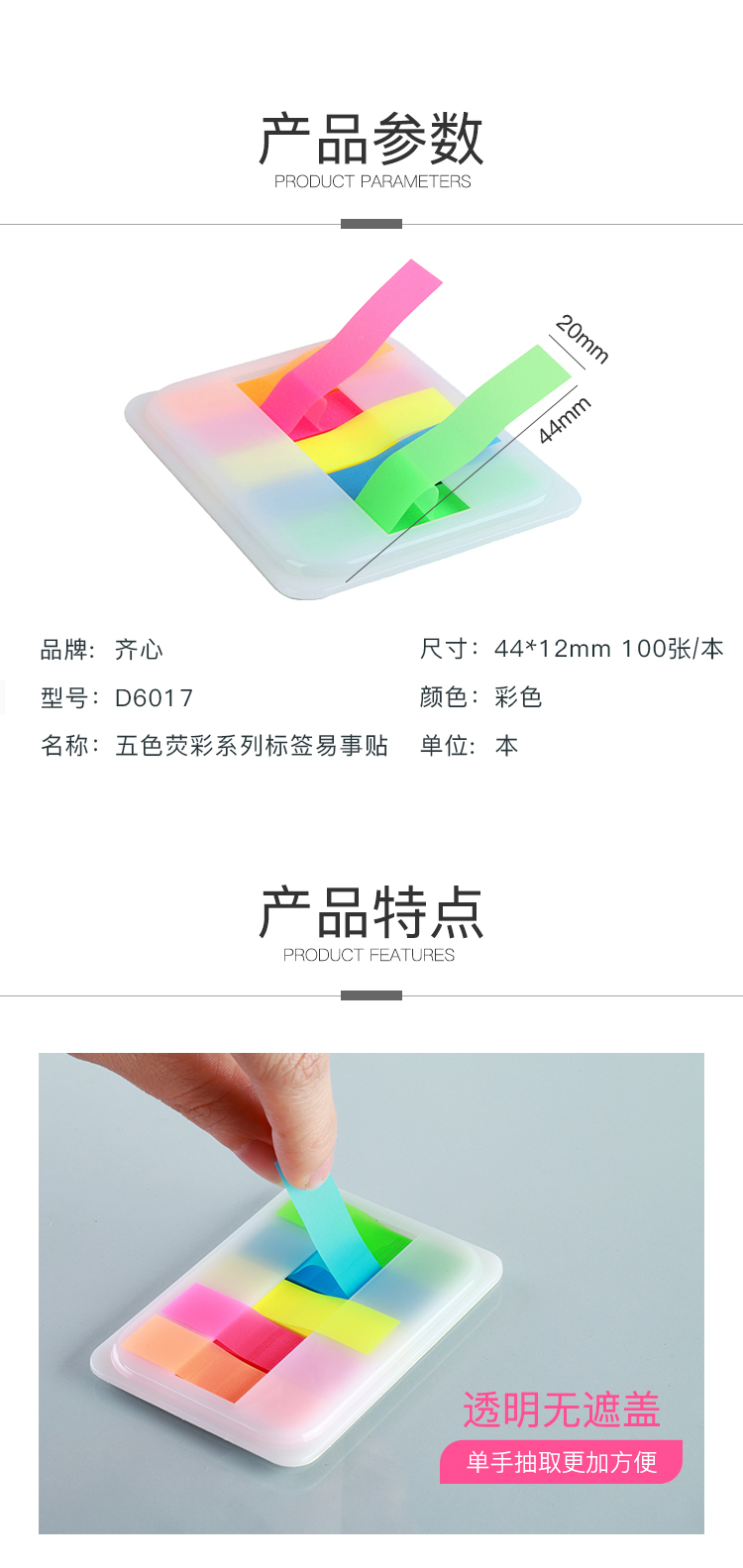 商品名称:齐心 D6017 五色荧彩系列标签易事贴 44*12mm 配色 100张/本 单位:本