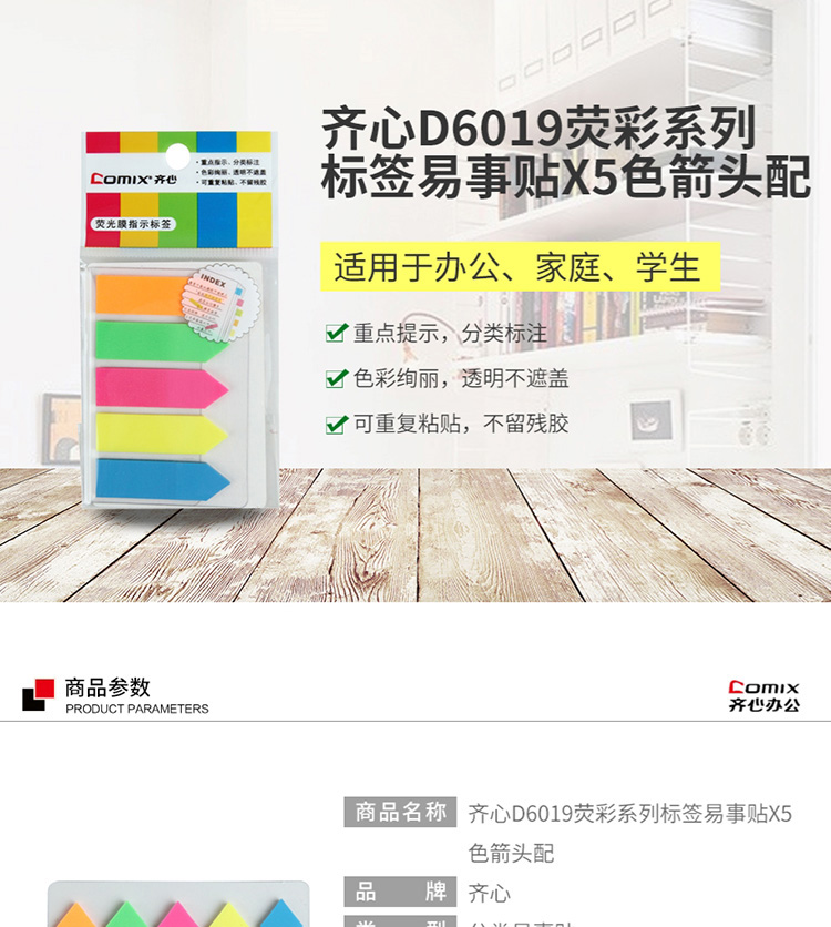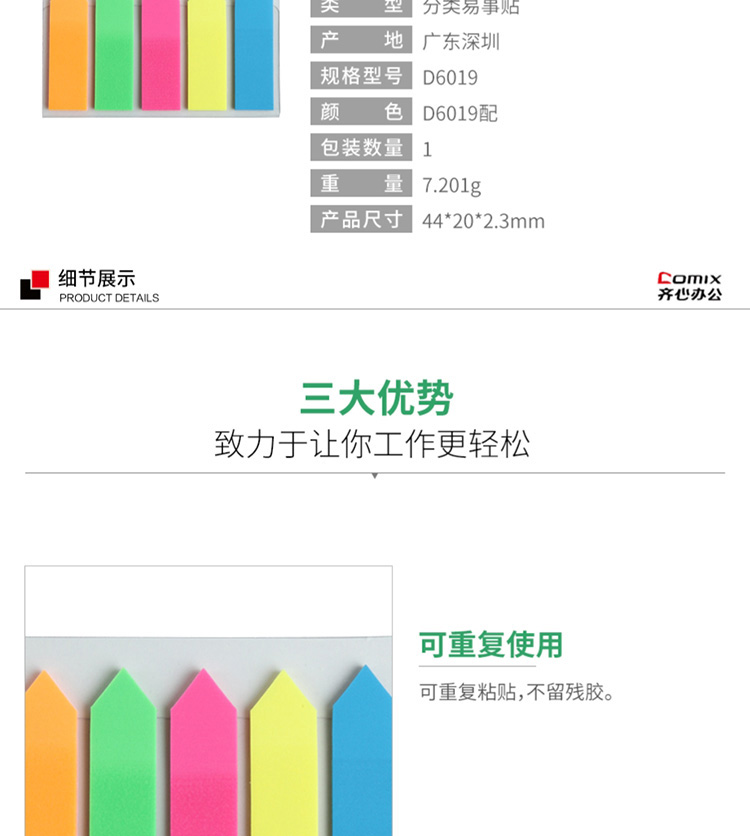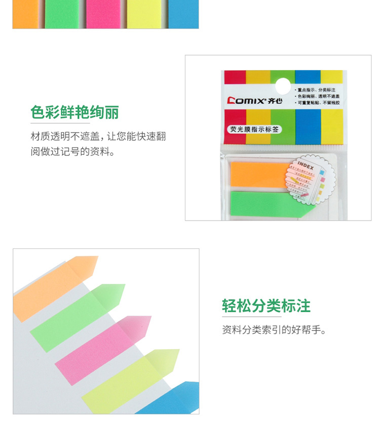 商品名称:齐心 D6019 五色荧彩系列标签便笺贴 44*12mm 配色 100张/本 单位:本