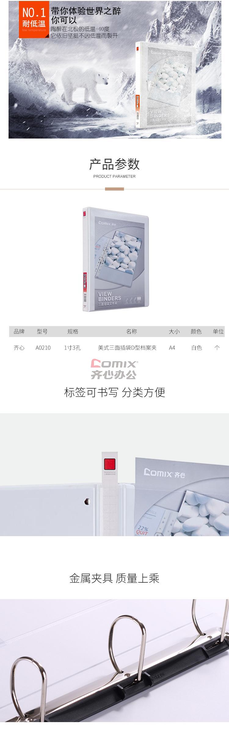 商品名称:齐心 A0210 美式三面插袋档案夹 1寸3孔D型夹 A4 白色 单位:个