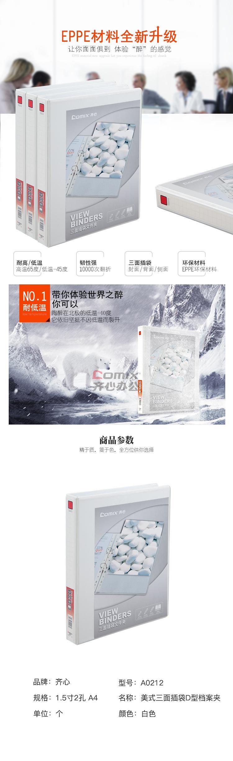 商品名称:齐心 A0212 美式三面插袋档案夹 1.5寸2孔D型夹 A4 白色 单位:个
