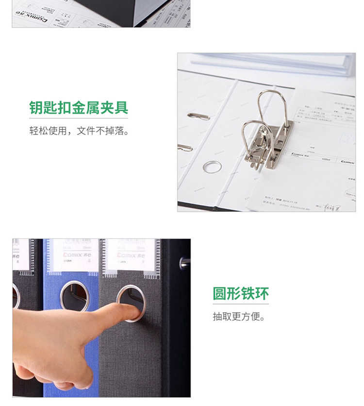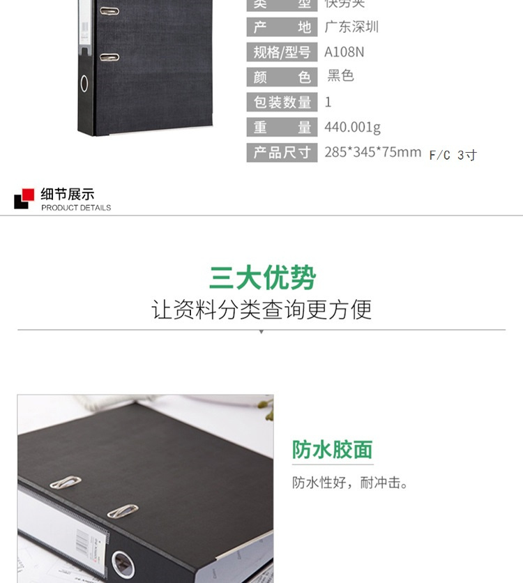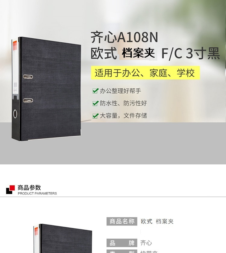 商品名称:齐心 A108N 欧式档案夹 3寸 F/C 黑色 单位:个
