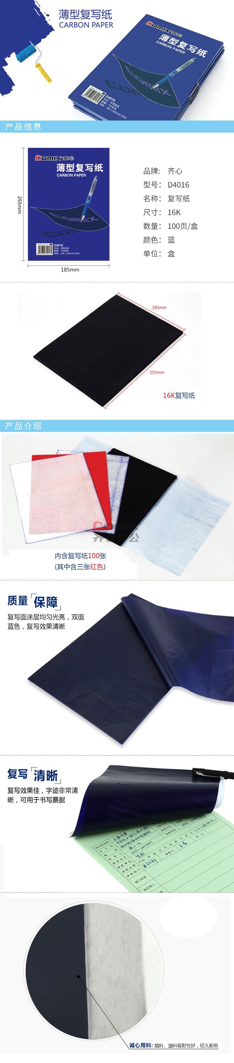商品名称:齐心 D4016 复写纸 16K 蓝色 100页/盒 单位:盒