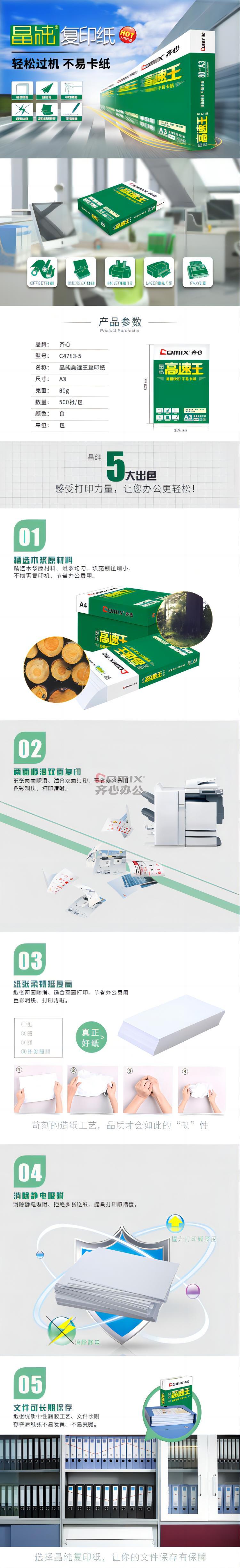 商品名称:齐心 C4783-5 晶纯高速王复印纸 A3 80克 白色 500张/包 单位:包