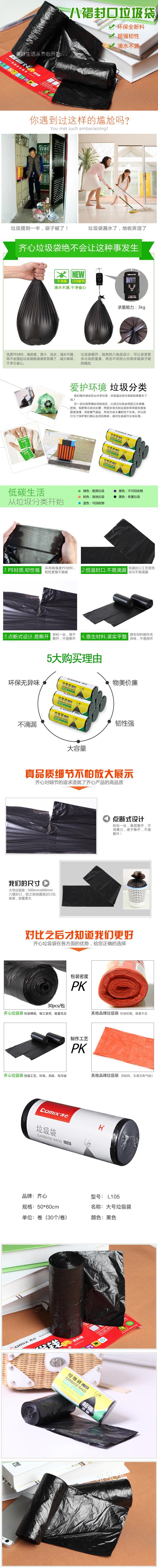 商品名称:齐心 L105 大号垃圾袋 50*60cm 黑色 30个/卷 单位:卷