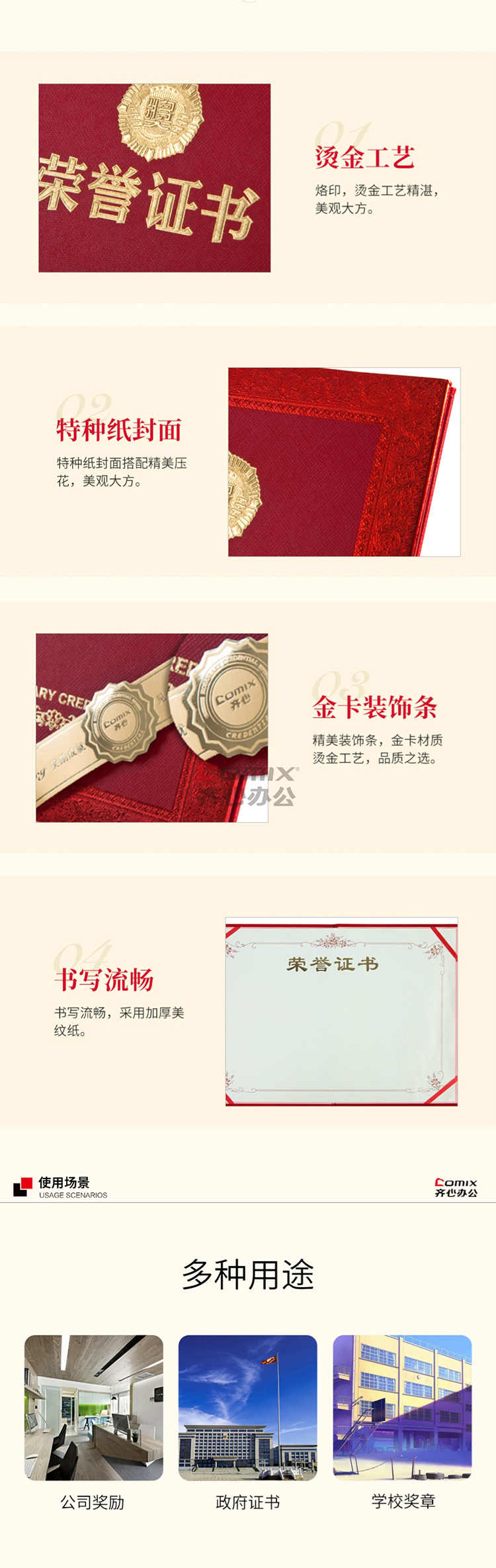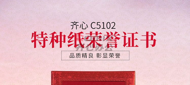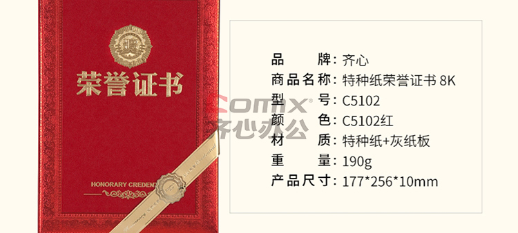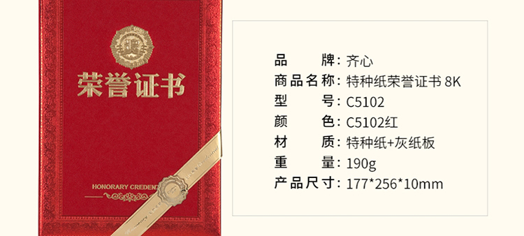 商品名称:齐心 C5102 特种纸荣誉证书 8K 红色 单位:本