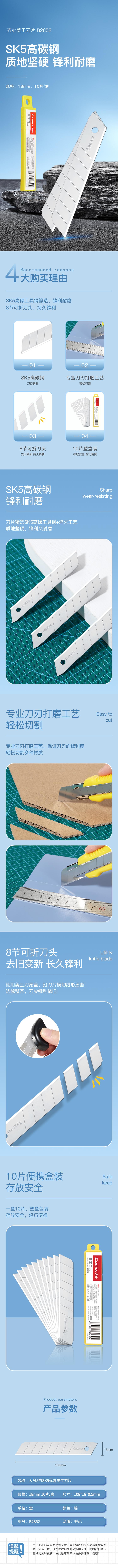 商品名称:齐心 B2852 大号8节SK5标准美工刀片 18mm 镍色 10片/盒 单位:盒