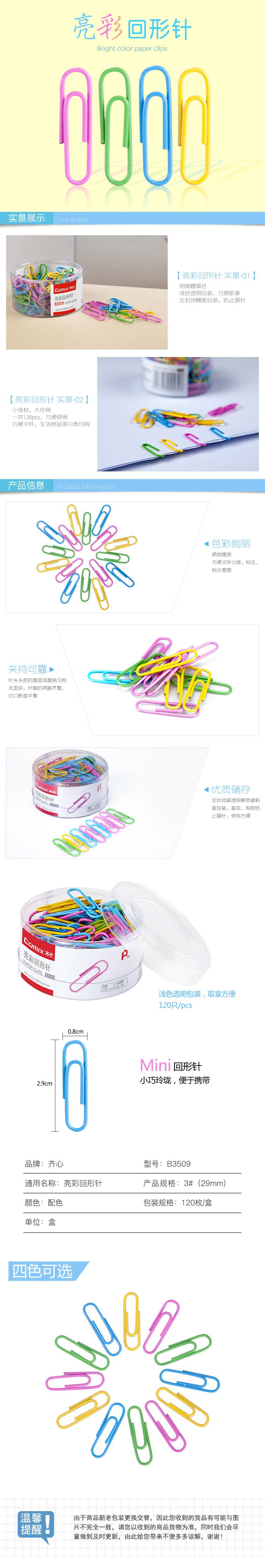 商品名称:齐心 B3509 亮彩回形针 29mm 彩色 120枚/筒 单位:筒