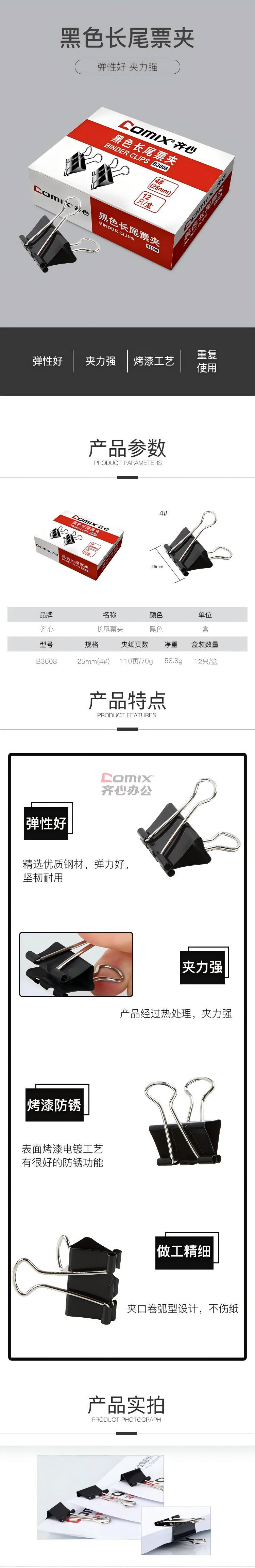 商品名称:齐心 B3608 长尾票夹 25mm 黑色 12只/盒 单位:盒