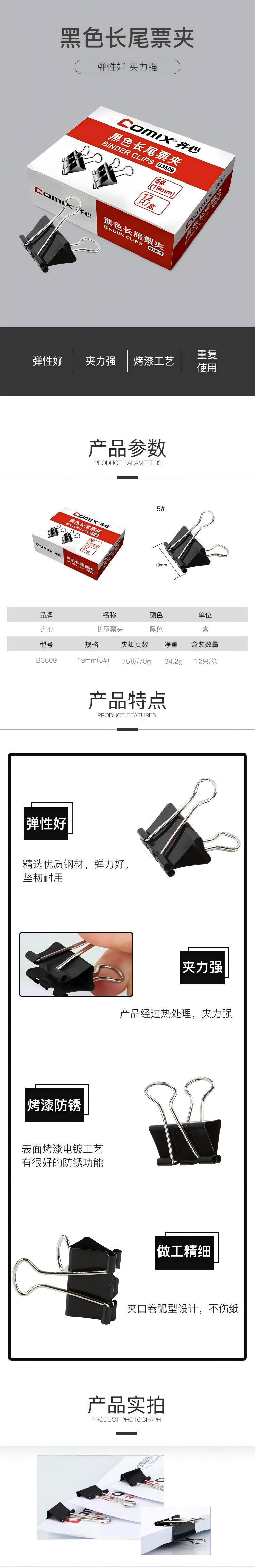商品名称:齐心 B3609 长尾票夹 19mm 黑色 12只/盒 单位:盒