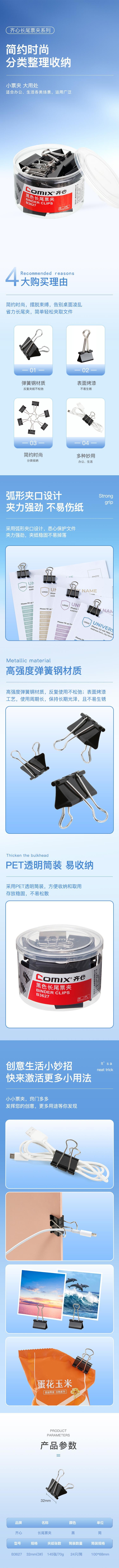 商品名称:齐心 B3627 长尾票夹 32mm 黑色 24只/筒 单位:筒