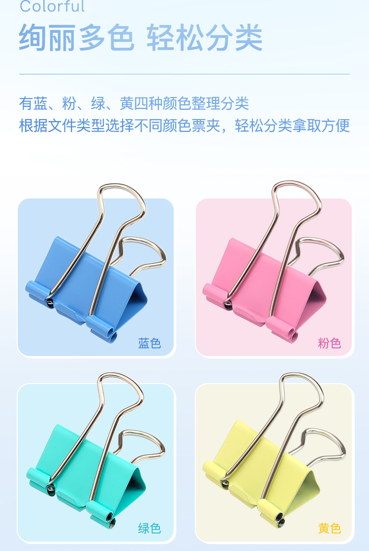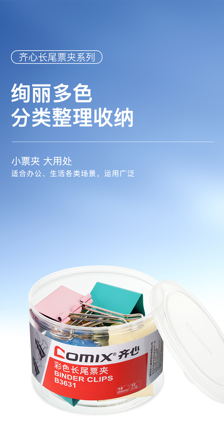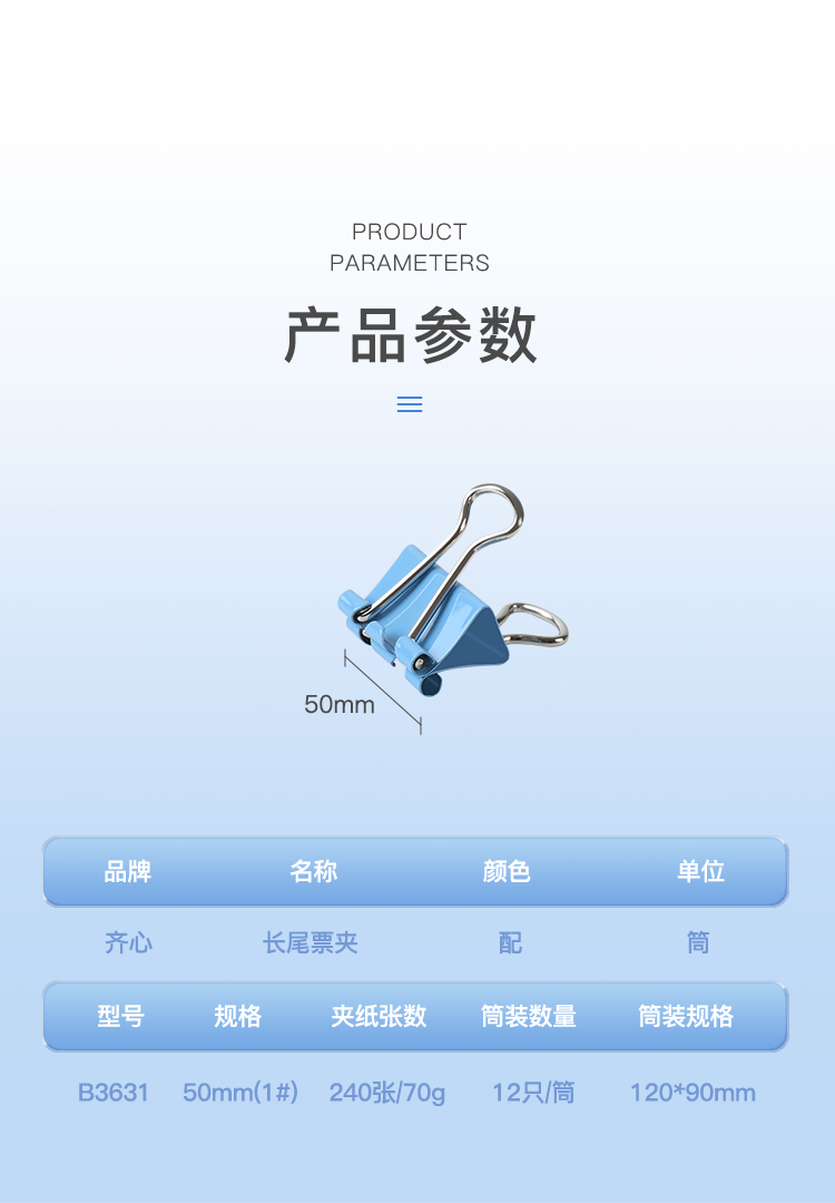 商品名称:齐心 B3631 长尾票夹 50mm 配色 12只/筒 单位:筒