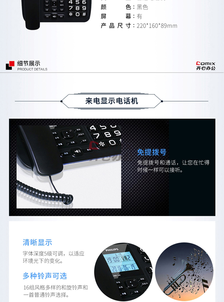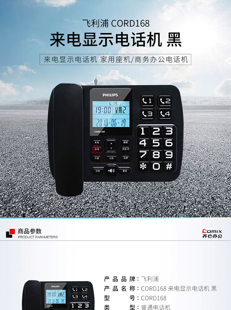 商品名称:飞利浦 CORD168 来电显示电话机 黑色 单位:台