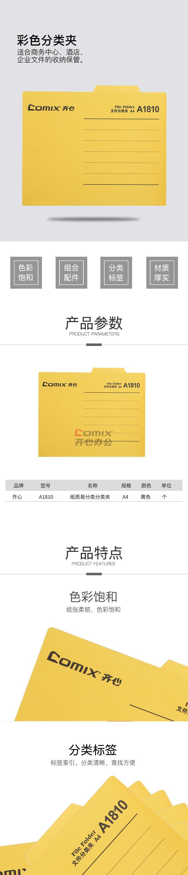 商品名称:齐心 A1810 纸质易分类分类夹 A4 黄色 单位:个