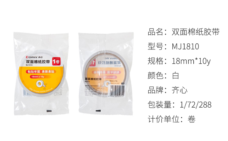 商品名称:齐心 MJ1810 双面棉纸胶带 18mm*10y 白色 1卷/袋 单位:袋