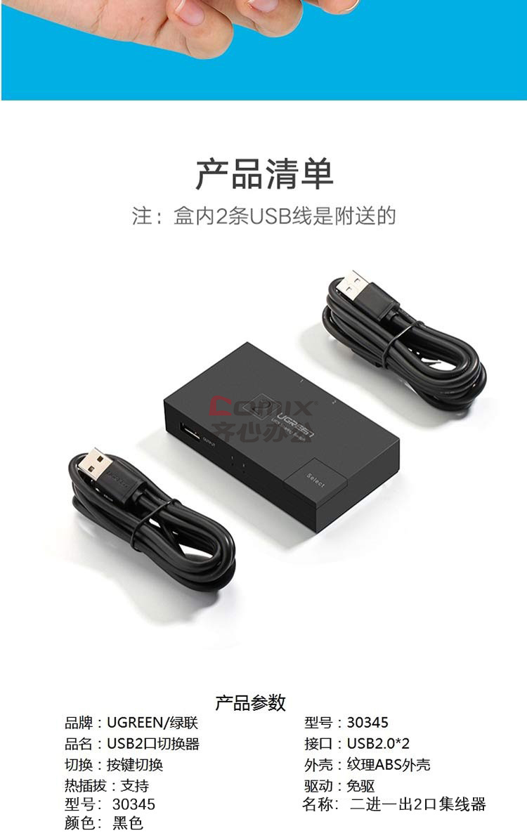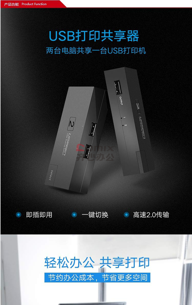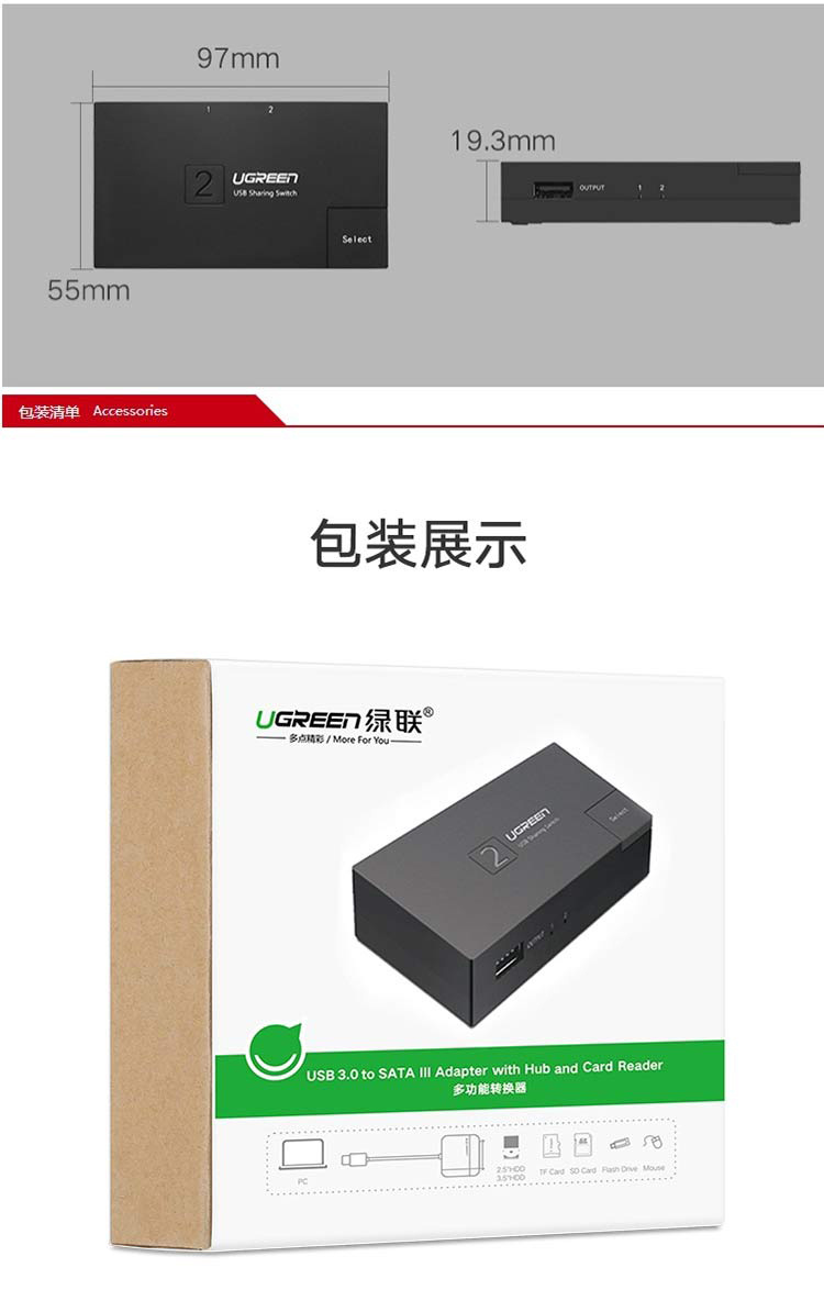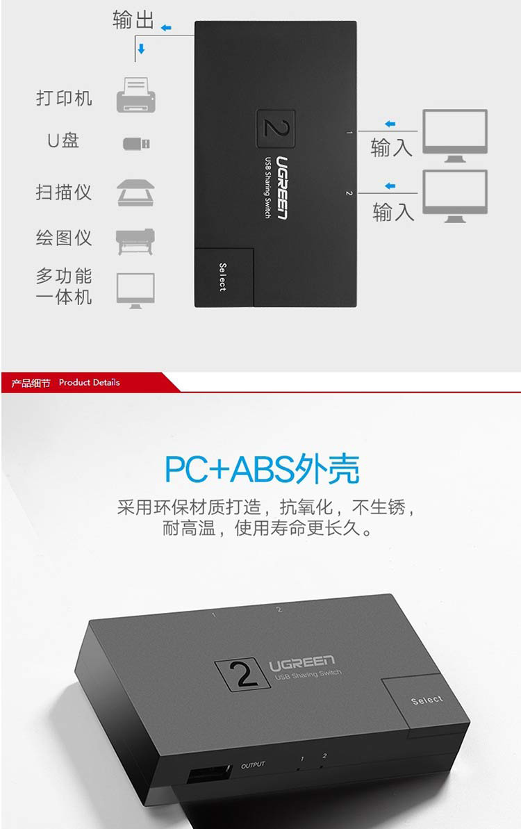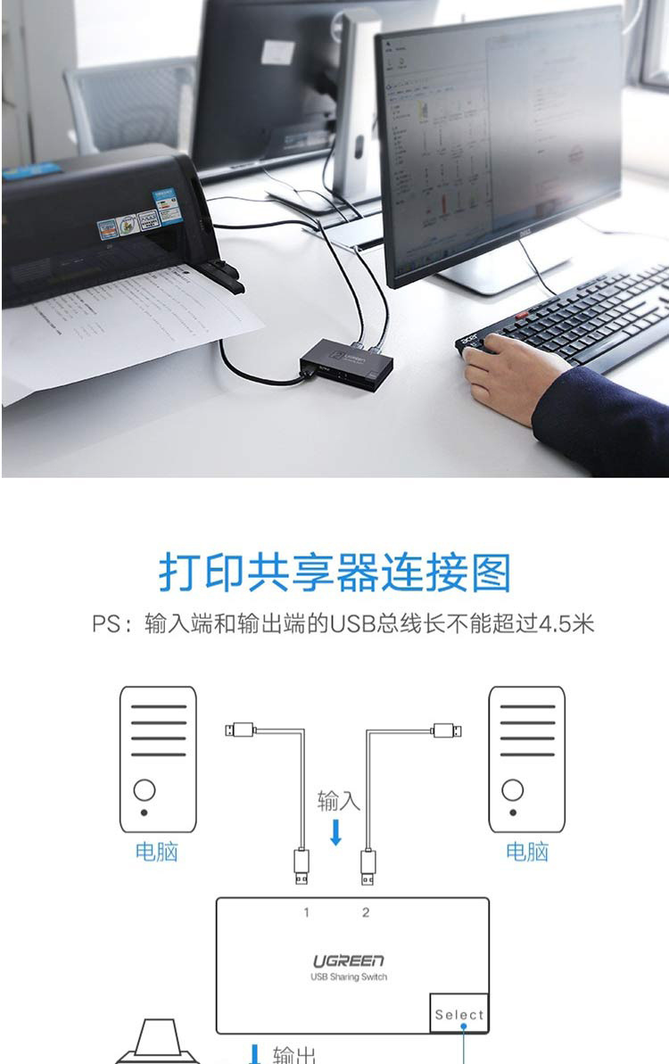 商品名称:绿联 30345 USB打印机共享器二进一出分屏器 单位:个 黑色