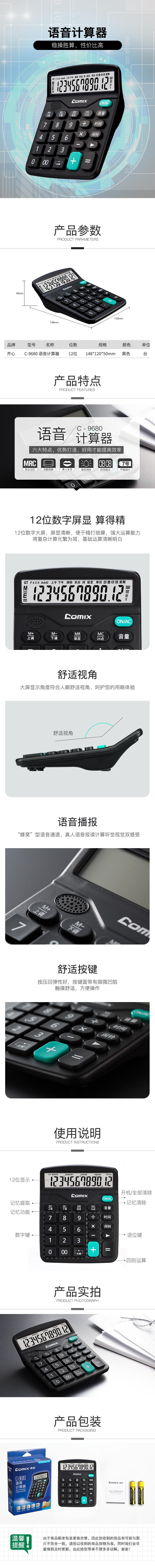 齐心(COMIX) C-9680 语音计算器 12位 148*120*50mm 黑色 单位:台
